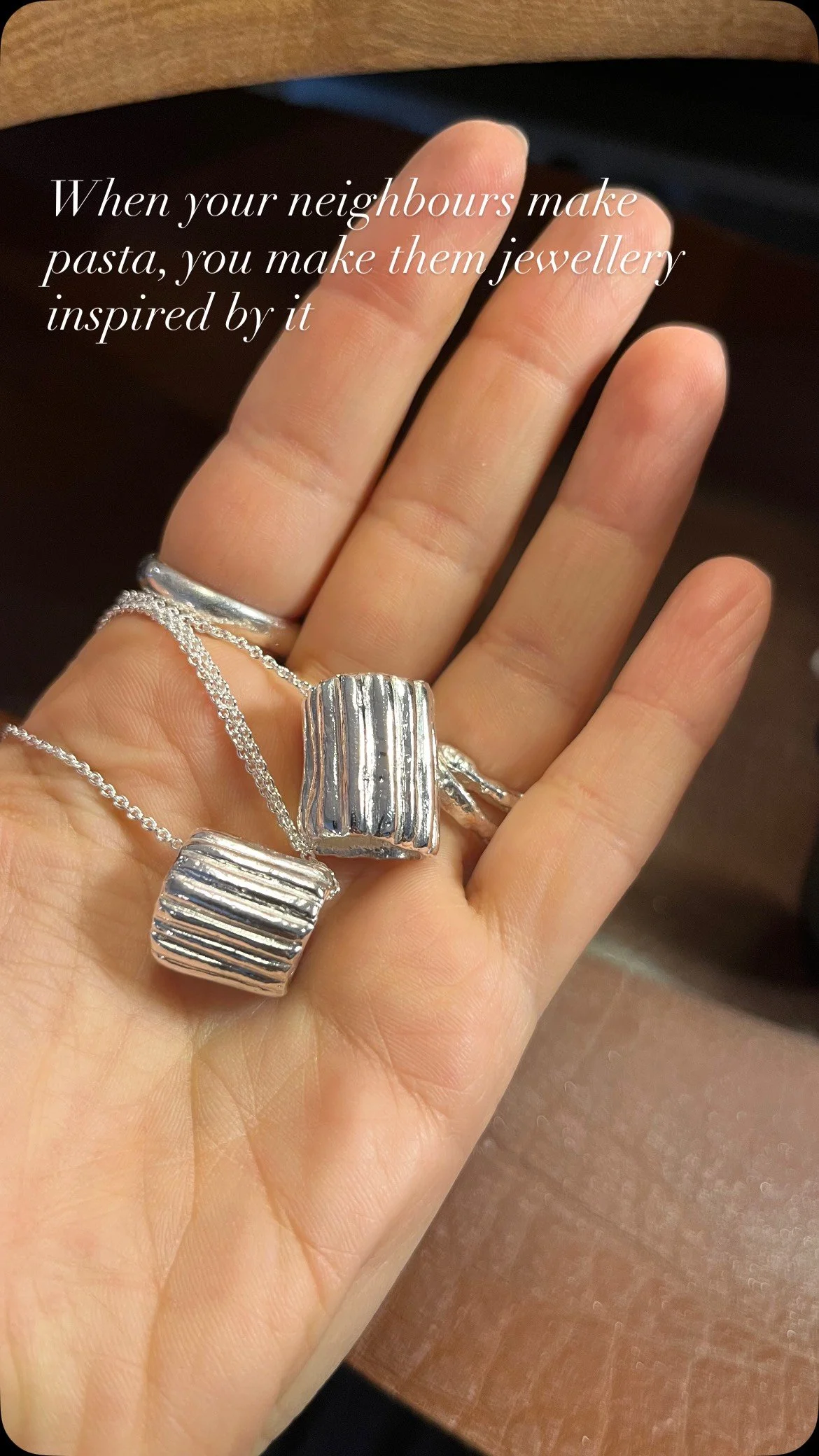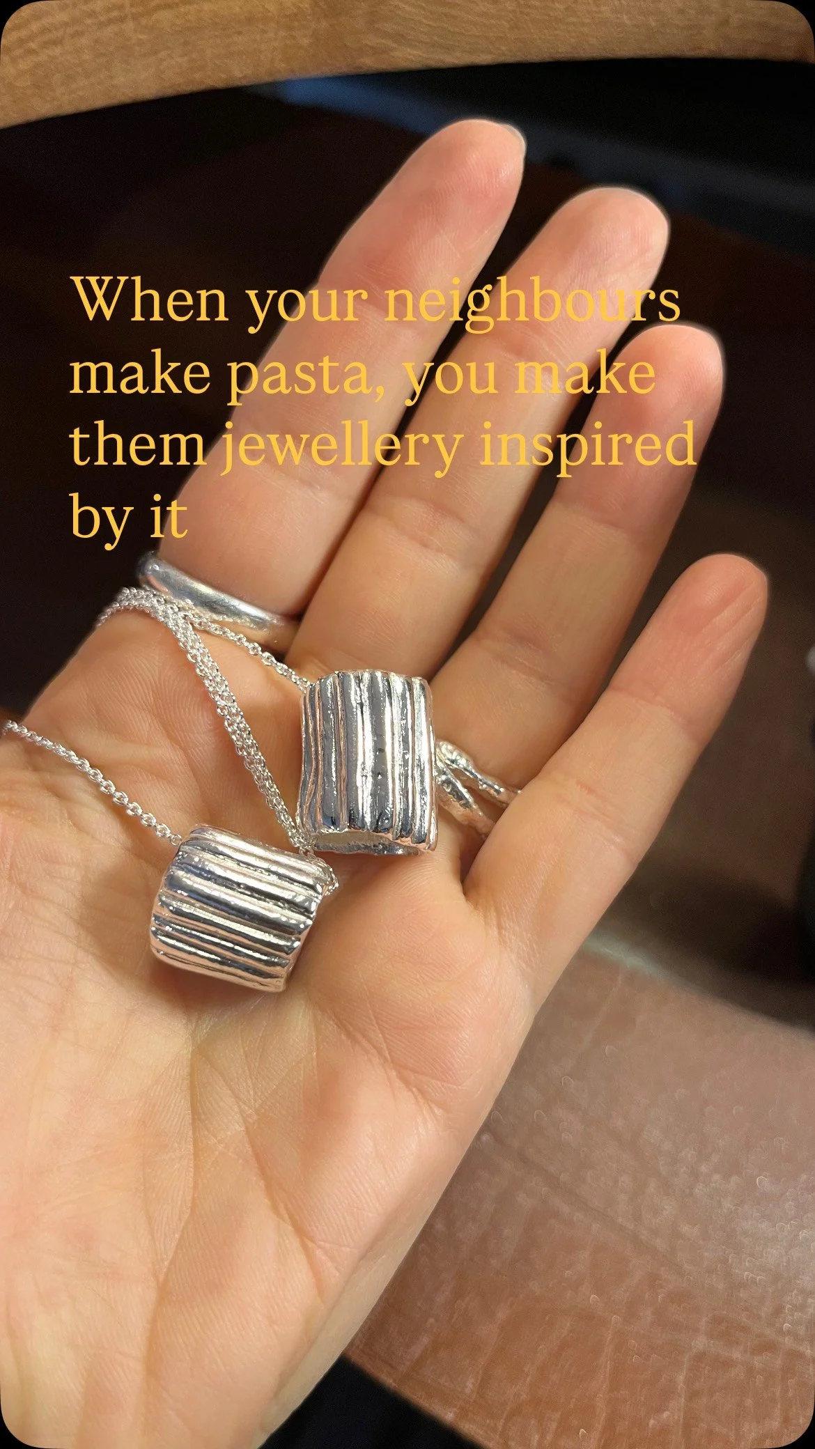 Each piece is handmade with care and intention, using traditional techniques like lost-wax casting to shape organic, tactile forms. I find inspiration in nature, antique jewellery, and symbolic details, letting texture and imperfection guide the creative process.